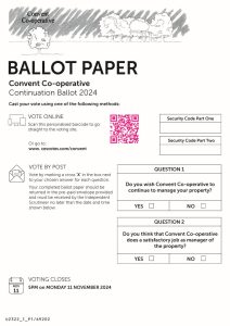 *All leaseholders, freeholders and council tenants have been sent a ballot paper, and have been asked to vote on whether they want to continue as a Co-op or if they would prefer to hand management of the Co-op back to Wandsworth Council. Please note: Shareholder membership has nothing to do with the ballot vote.
