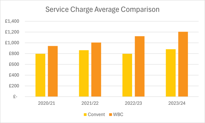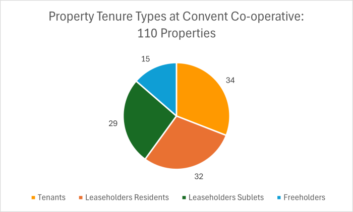 The above graph shows how Convent Co-operative, with 34 tenanted properties and 61 leaseholders, compares to other co-operatives in the borough.